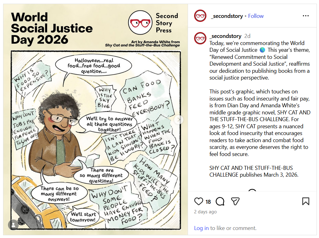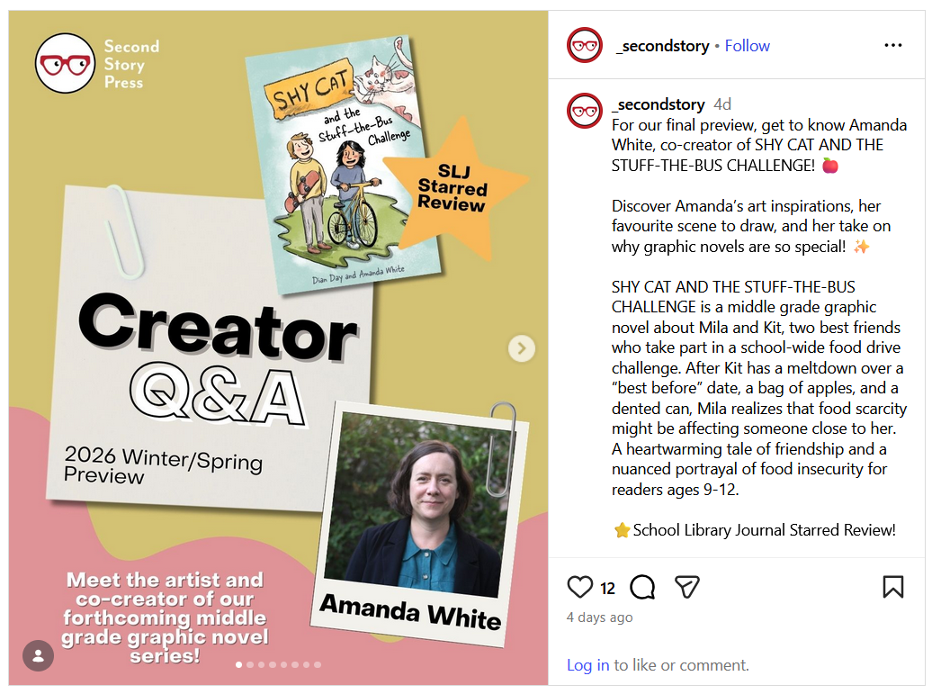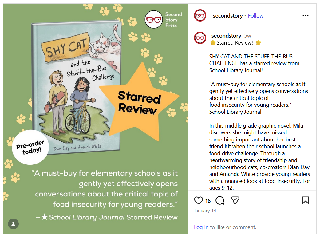 Shy Cat and the Stuff-the-Bus Challenge, published by Second Story Press, is a 200-page graphic novel for middle grade readers about friendship, neighbourhood cats, and growing up… just a little.